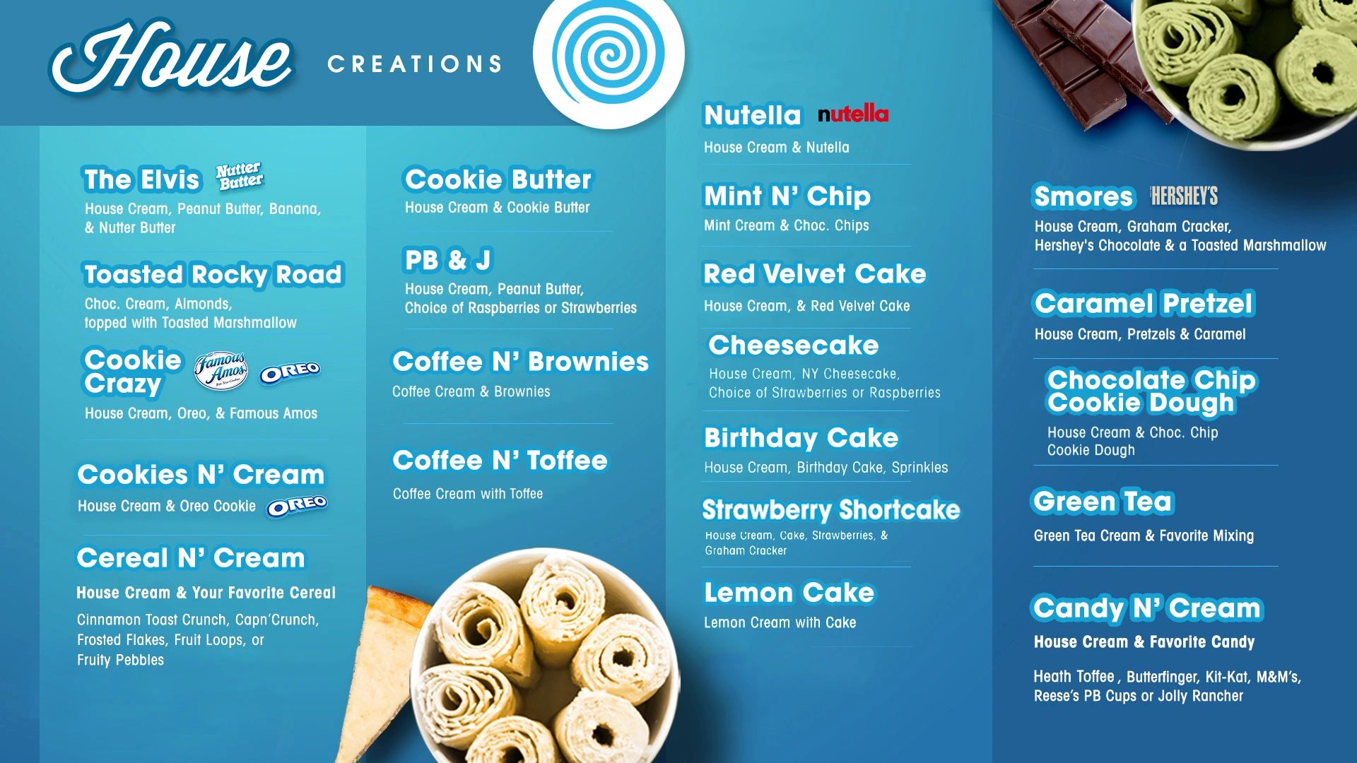 Chill Rolled Ice Cream Menu Chill Rolled Ice Cream Menu / Your choice of cereal combined with our fresh, made while you watch, premium ice cream.